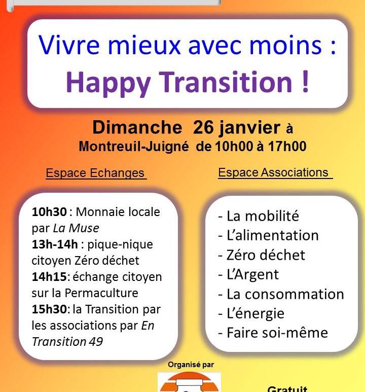 L’ADEMJ (Zéro Déchet Montreuil Juigné) organise cet événement dimanche 26 janvier, à la salle Jacques Brel de 10h à 13h et de 14h à 17h. Au programme : stands, conférences, échanges avec des acteurs de la transition sur les thèmes de l’alimentation, la mobilité, les biens de consommation, le logement …. En Transition interviendra dans l’après-midi pour une conférence-débat. Evénement Facebook : https://www.facebook.com/events/969950546717764/ Réécoutez l’émission … Continuer de lire 26/01 : Vivre mieux avec moins : happy transition
