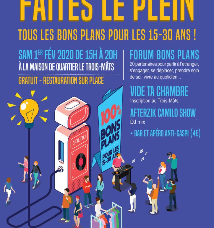 Samedi 1er février 2020 au centre socio-culturel Le Trois-Mâts à Angers, En Transition sera présent pour cet événement gratuit qui recense tous les bons plans pour les 15-30 ans. L’occasion de présenter Demain en poche, notre guide du Maine-et-Loire plein de bons plans pour une vie + solidaire et + écologique. Programme sur http://www.letroismats.fr/faites-le-plein/ Continuer de lire 01/02 : Faites le plein (15-30 ans)