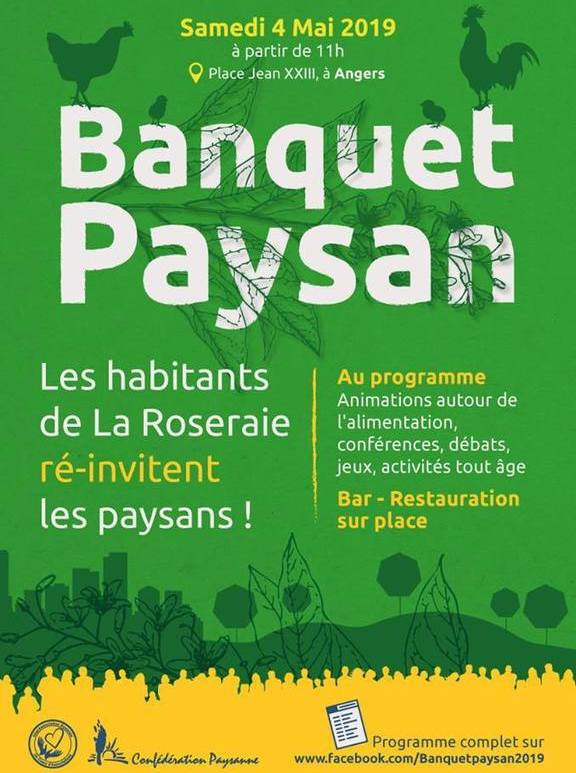 Les habitants de la Roseraie ré-invitent les paysans ! Samedi 4 mai 2019, de 11h à 18h, place Jean XXIII à Angers. Animations autour de l’alimentation, retour sur l’histoire maraichère de la Roseraie, repas paysan, animaux de la ferme, concerts. En Transition sera présent avec un stand. Au plaisir de vous rencontrer. Accès libre Toutes les infos : https://www.facebook.com/Banquetpaysan2019/ Et en amont : Samedi 27 avril, … Continuer de lire 04/05 : Banquet Paysan 2019